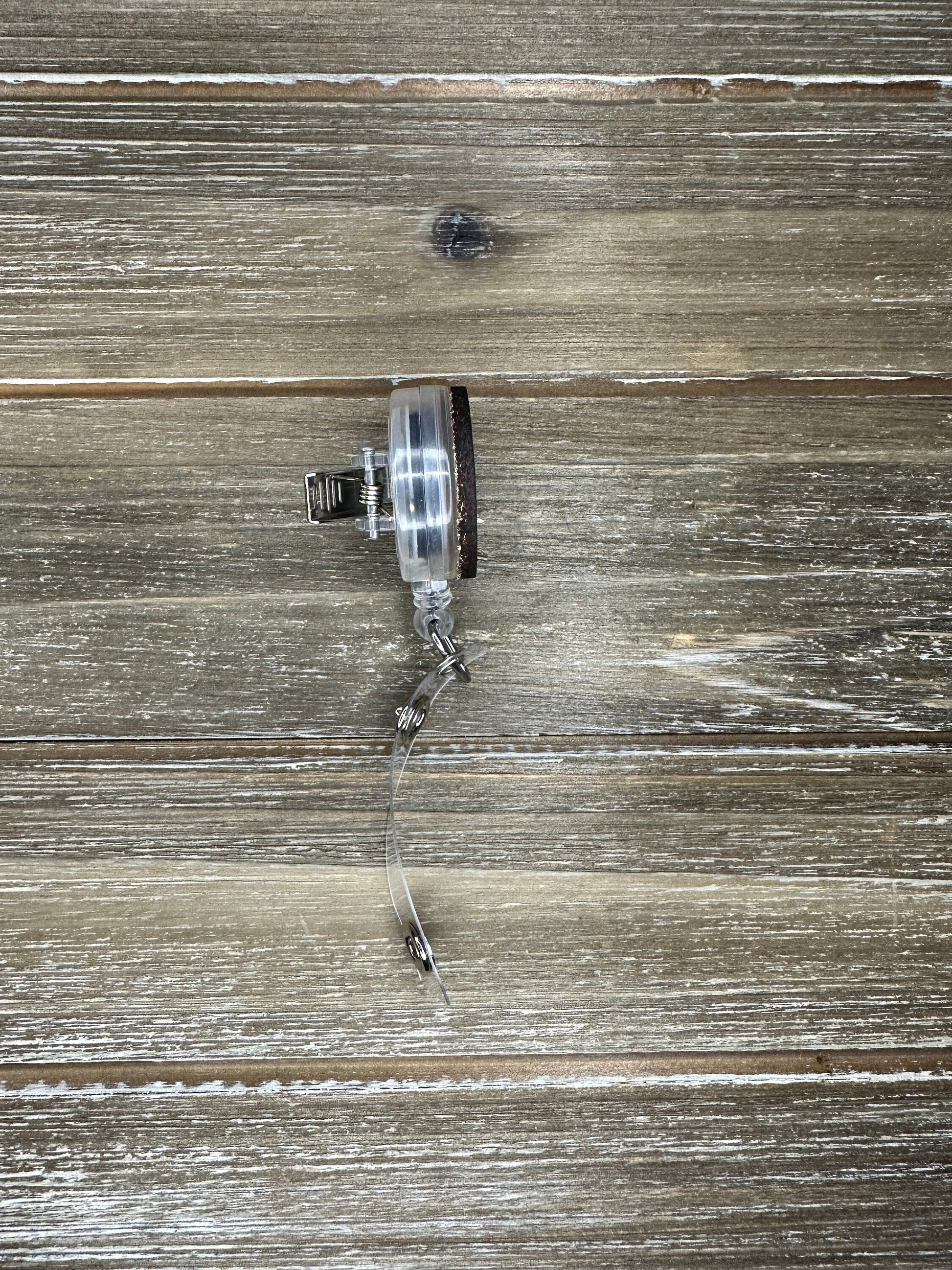 Laser engraved Buck deer Badge reel button on brand new reel. Deer is laser engraved on Veg tanned leather then dyed brown on color using leather dye and sealed using Neatsfoot leather oil.