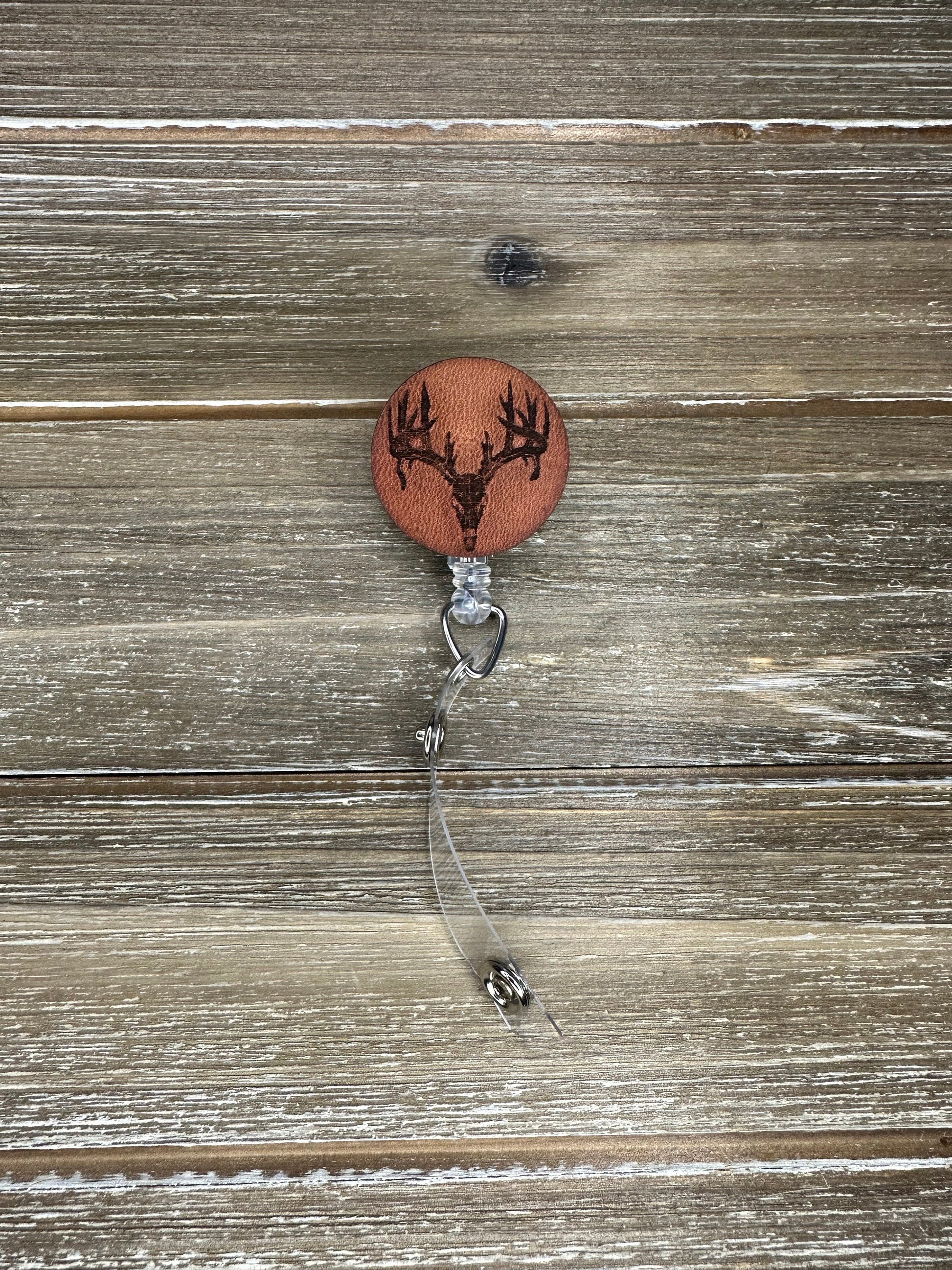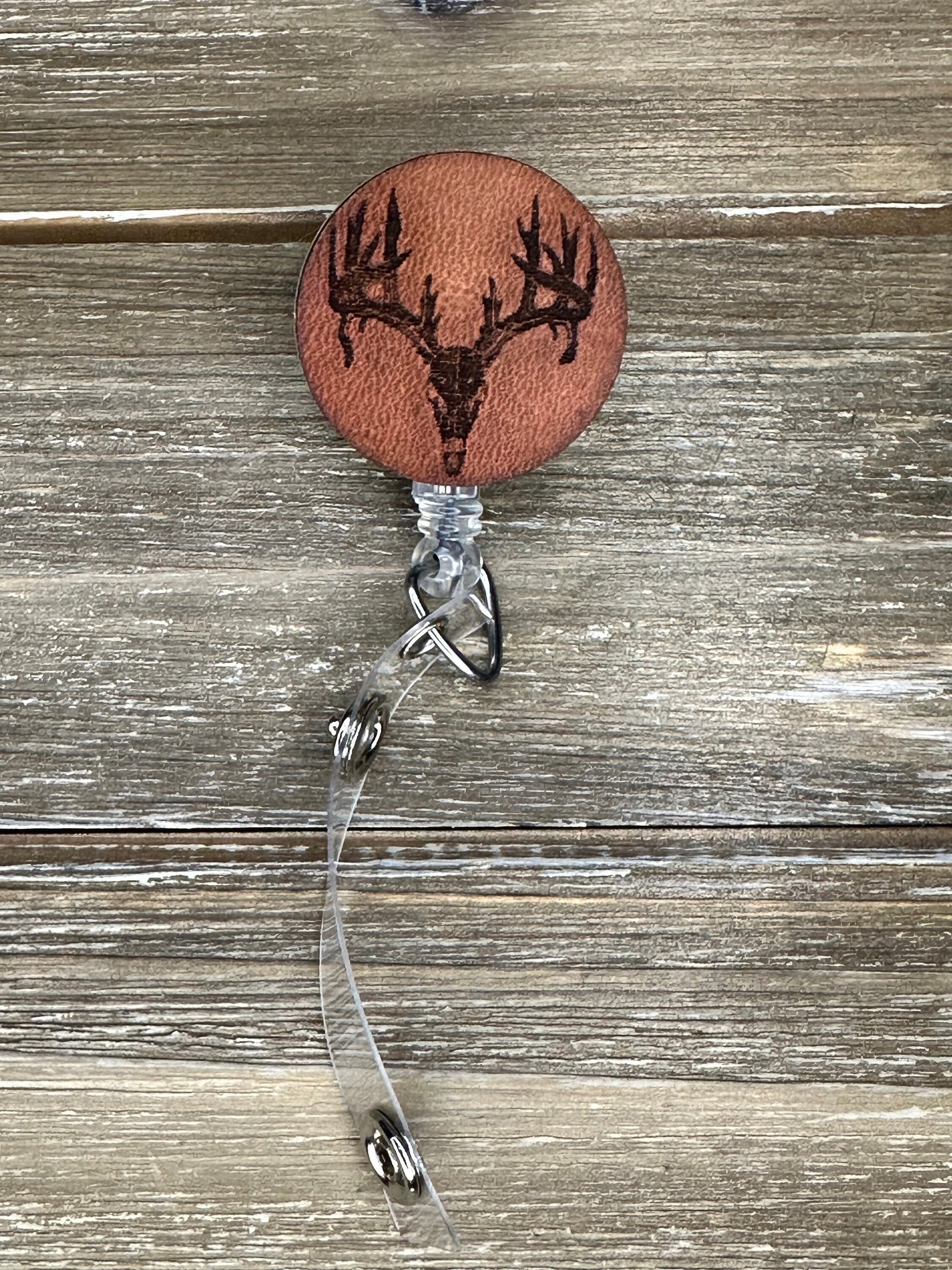 Leather Engraved Deer skull badge reel on veg tanned leather